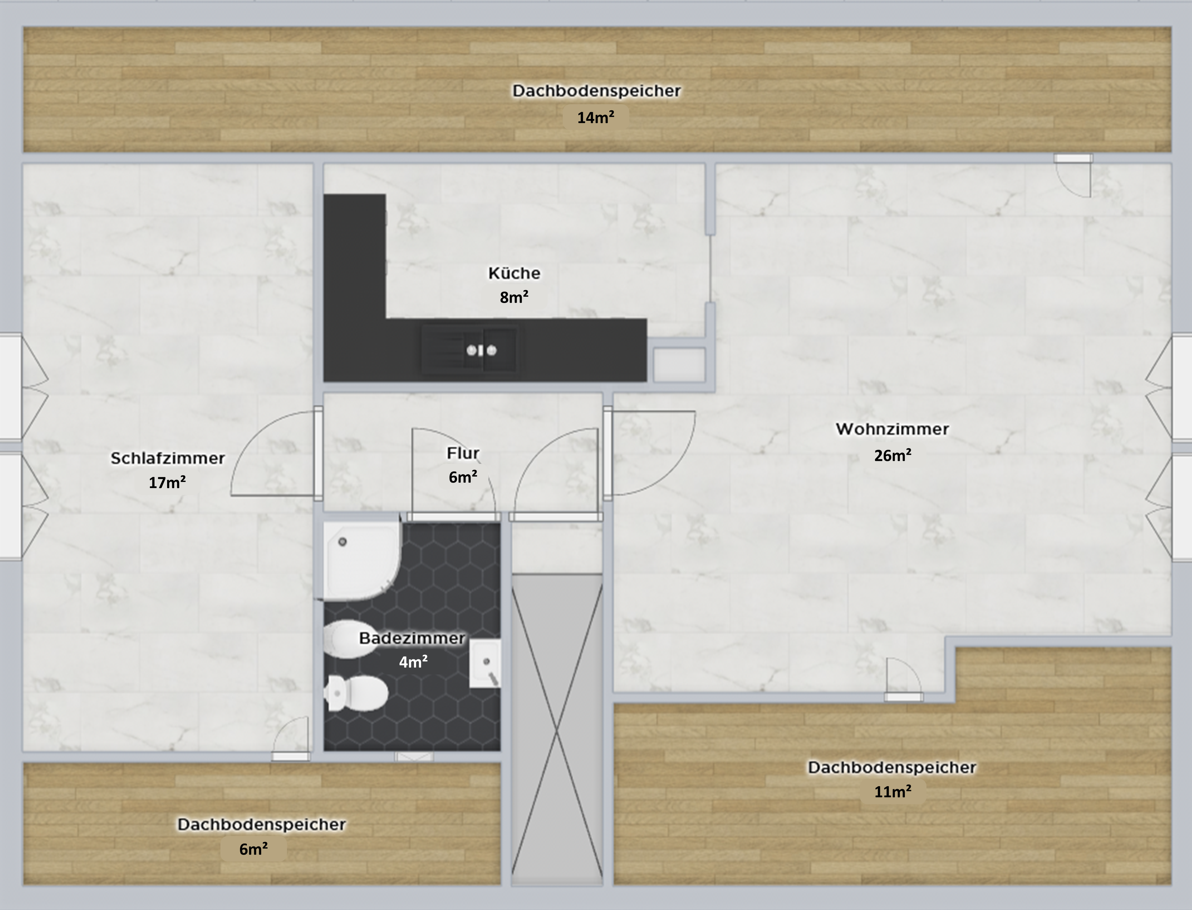 Das Dachgeschoss kann auch als Einliegerwohnung benutzt werden, denn es verfügt über eine vollwertige Einbauküche, Bade-, Schlaf- und Wohnzimmer. Über das Dachgeschoss erreicht man drei Speicher (seitlich gelegen) sowie den Spitzboden.