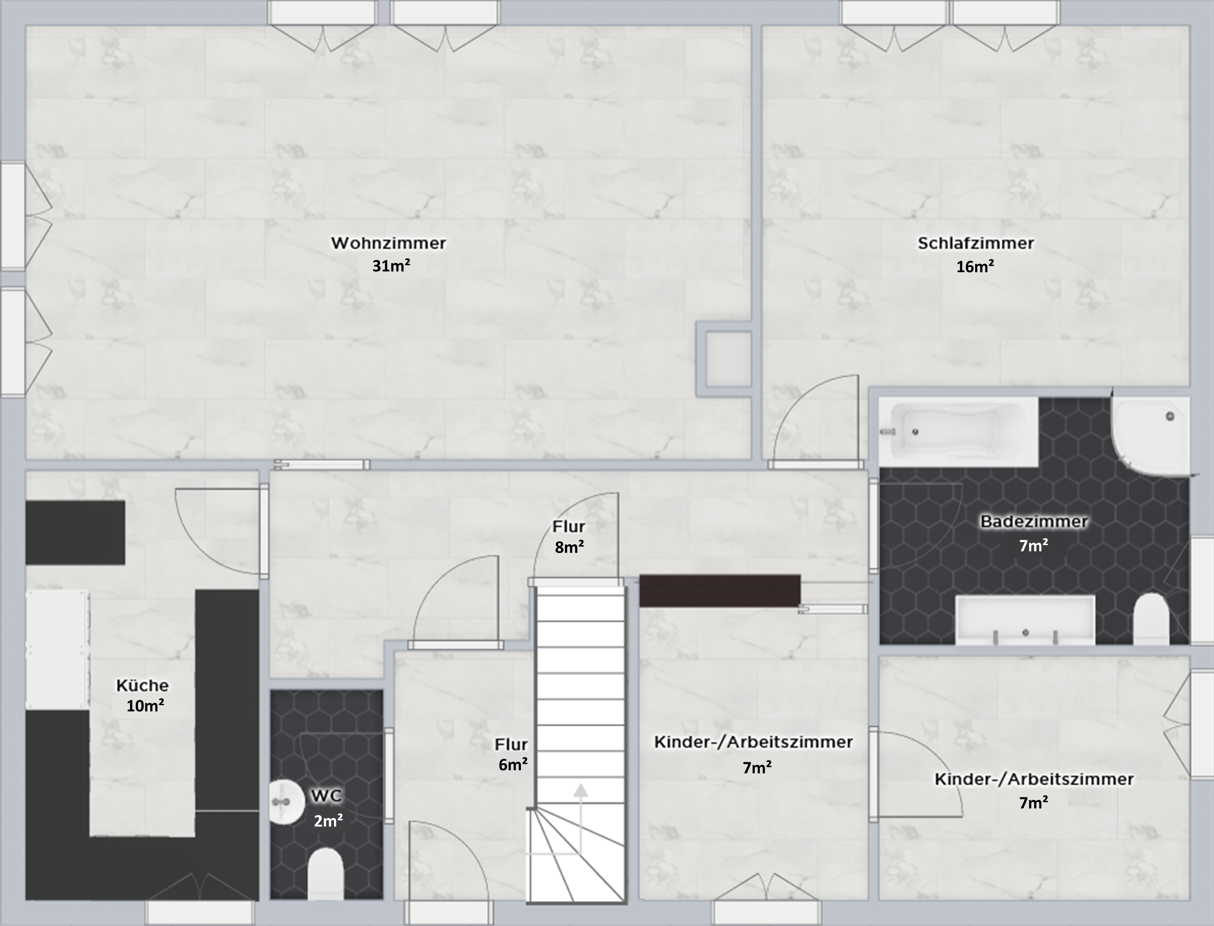 Das Erdgeschoss bietet mit 110 m² die größte Wohnfläche mit zwei Kinderzimmern/Büros, einem Schlafzimmer, einem großem, sehr hellem Wohnzimmer mit Gartenzugang sowie dem Badezimmer und der hochwertigen Einbauküche.
