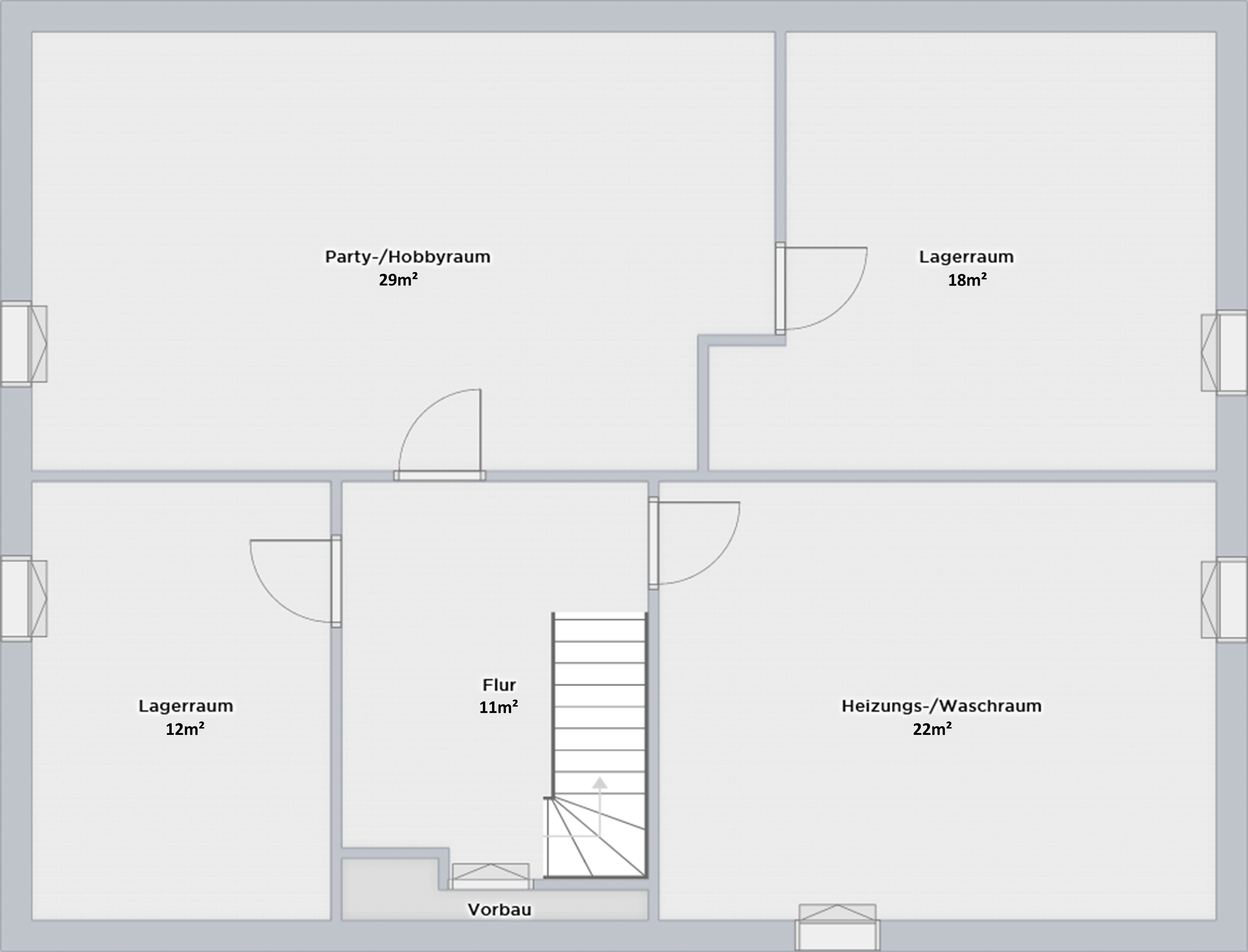 Highlight des Kellers ist der ausgebaute Party-/Hobbyraum mit Holzdecke, Spotbeleuchtung, neutralem, maßangefertigtem Teppich. Dazu gehören zwei Lagerräume, Heizungs- und Waschraum und alles verbunden durch einen Flur.